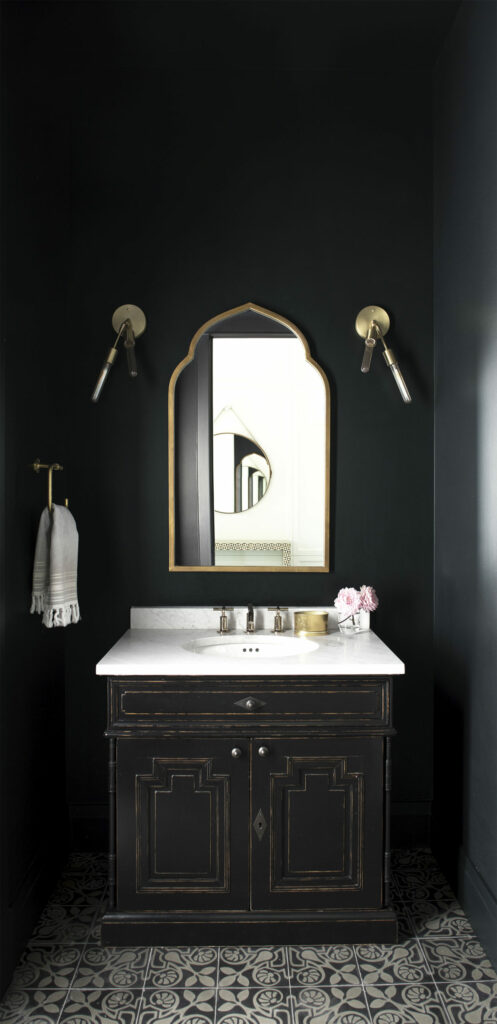 Regional Photography, Rocky Mountains, Bathroom, dark, brass, accents, flower, gold, hand towel, mirror, tile featuring (WALLS): Black Satin 2131-10, Aura