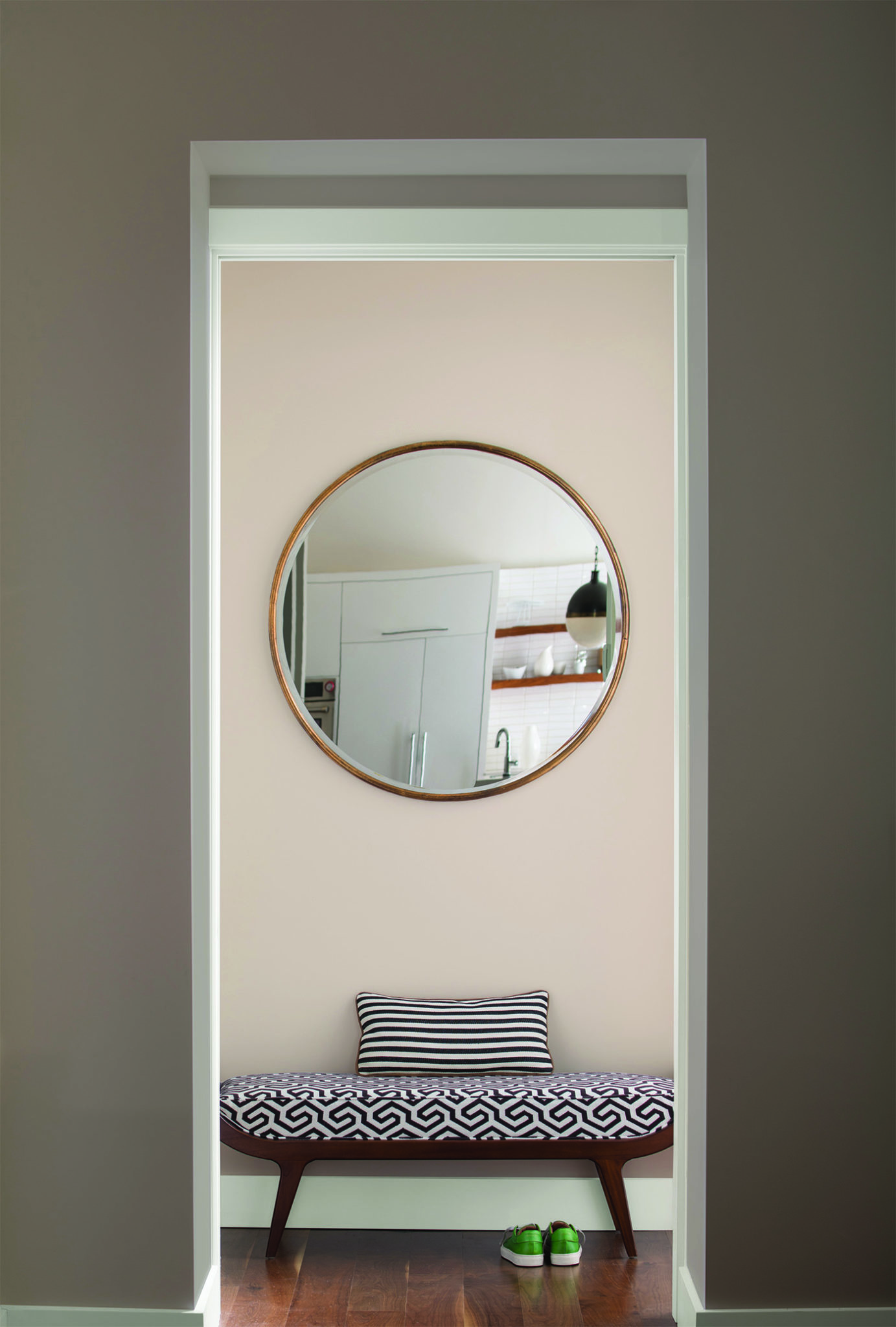 Regional Southwest Photography 2018 (southwest, nevada, texas, arizona, new mexico) featuring round mirror, hallway, beige, bench, interior, striped pillow, green shoes featuring (NEAR WALL): Driftwood 2107-40 Regal® Select, Matte (FAR WALL): Soft Satin 2164-60 Regal® Select, Matte (TRIM): Atrium White OC-145 ADVANCE®, Semi-Gloss