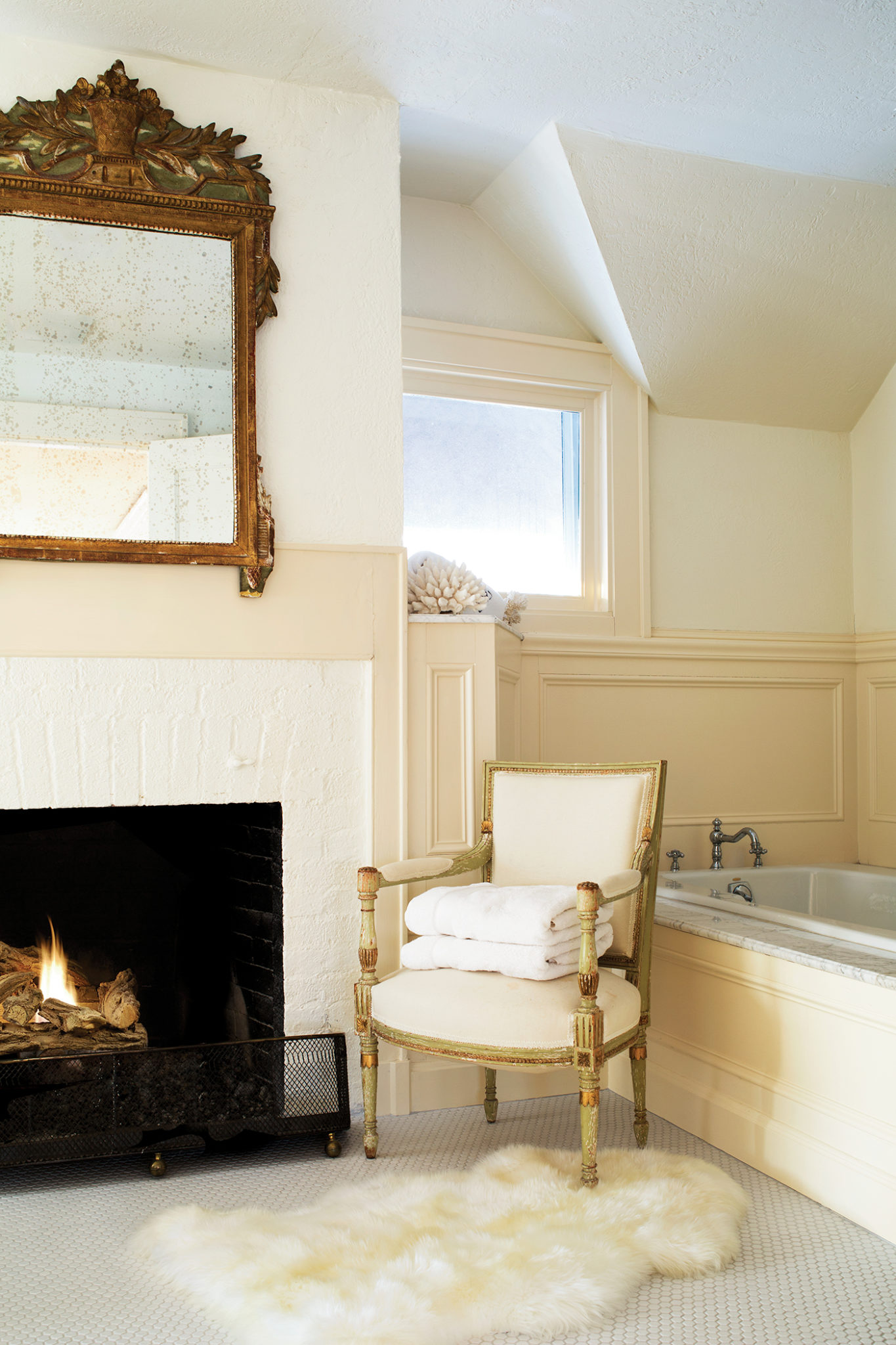 Residential interior bathroom featuring fireplace, arm chair and vintage mirror.