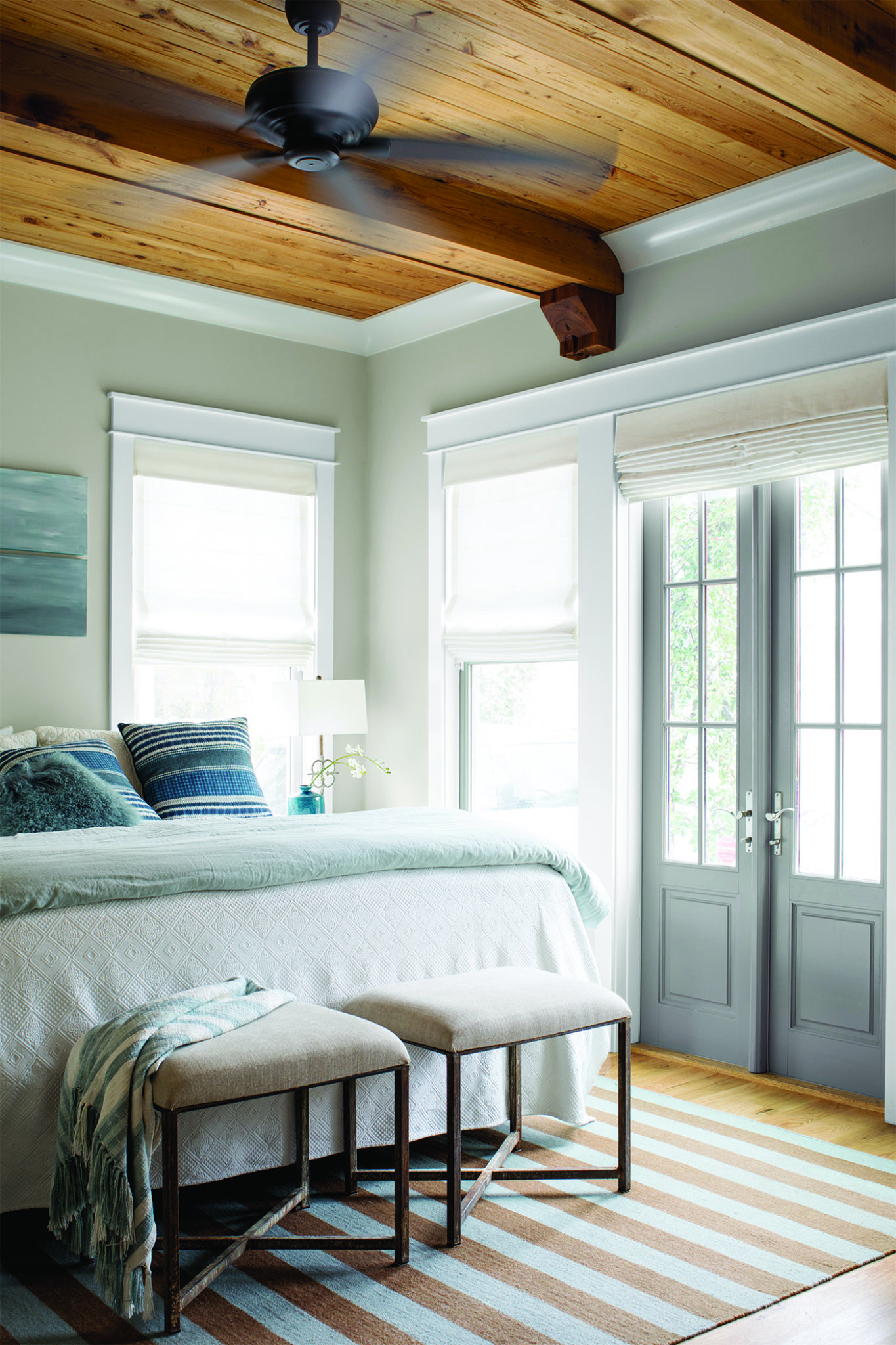 Regional Photography southeast, bedroom, interior, wood beam ceiling, striped area rug, french doors, ceiling fan, blue pillows featuring (WALLS): Wish AF-680, Natura®, Flat (TRIM): Pure White OC-64, Natura®, Semi-Gloss (DOORS): Storm AF-700, Natura®, Semi-Gloss