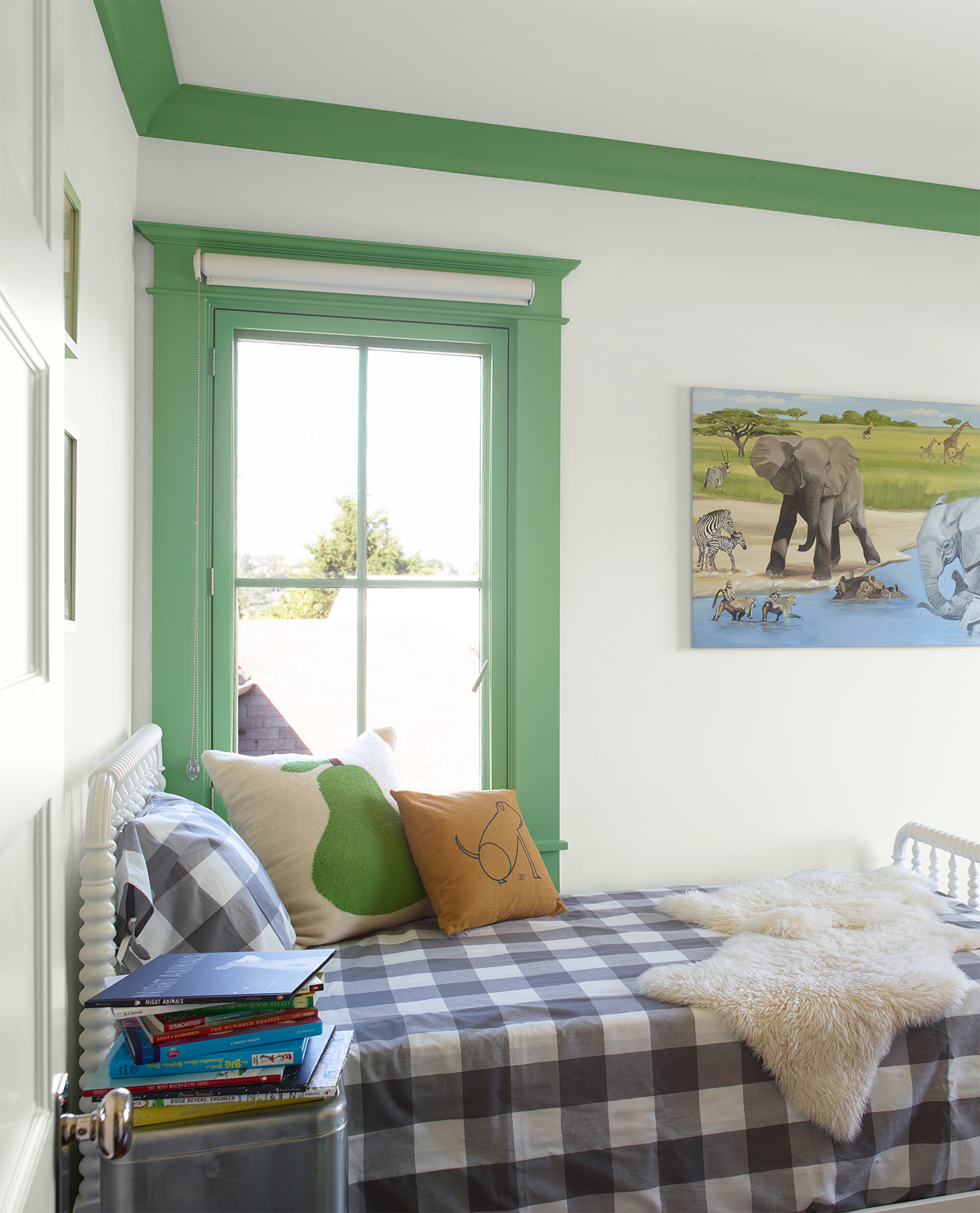 Regional Photography Pacific Northwest, kid room, child, elephant, zebra, twin bed, pillows, books, window, green, pear, basket, toys, stuffed animal featuring (WALLS):White Heron OC-57, Natura®, Eggshell (CEILING):White Heron OC-57 Natura®, Flat (TRIM):Cedar Green 2034-40 Natura®, Semi-Gloss (DOOR): White Heron OC-57 Natura®, Semi-Gloss