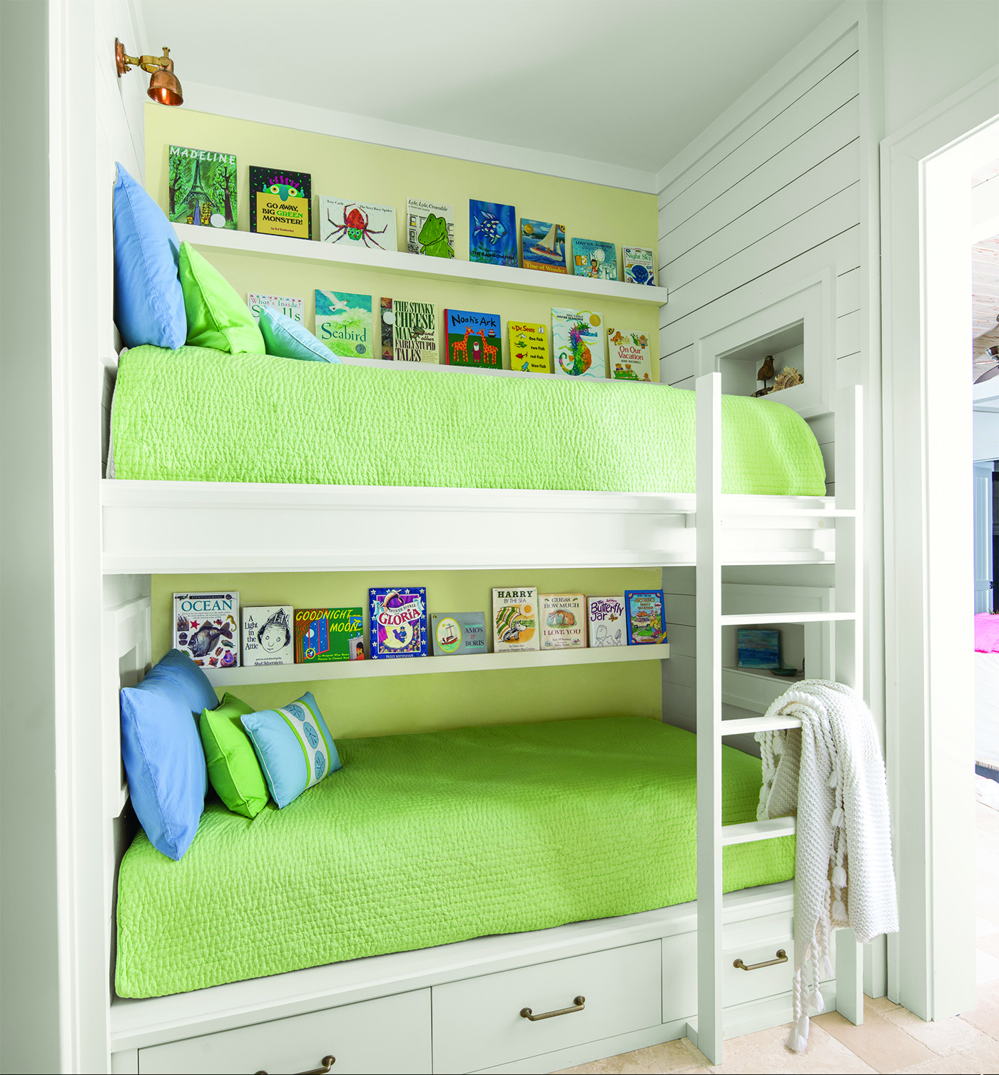 Regional Southeast Photography featuring childrens bedroom, bunk beds, white, light green sheets, books on shelf, southeast, florida, interior (WALLS): Rainforest Dew 2146-50, Natura®, Eggshell (TRIM): White Opulence OC-69, Natura®, Semi-Gloss (CEILING): White Opulence OC-69, Natura®, Flat