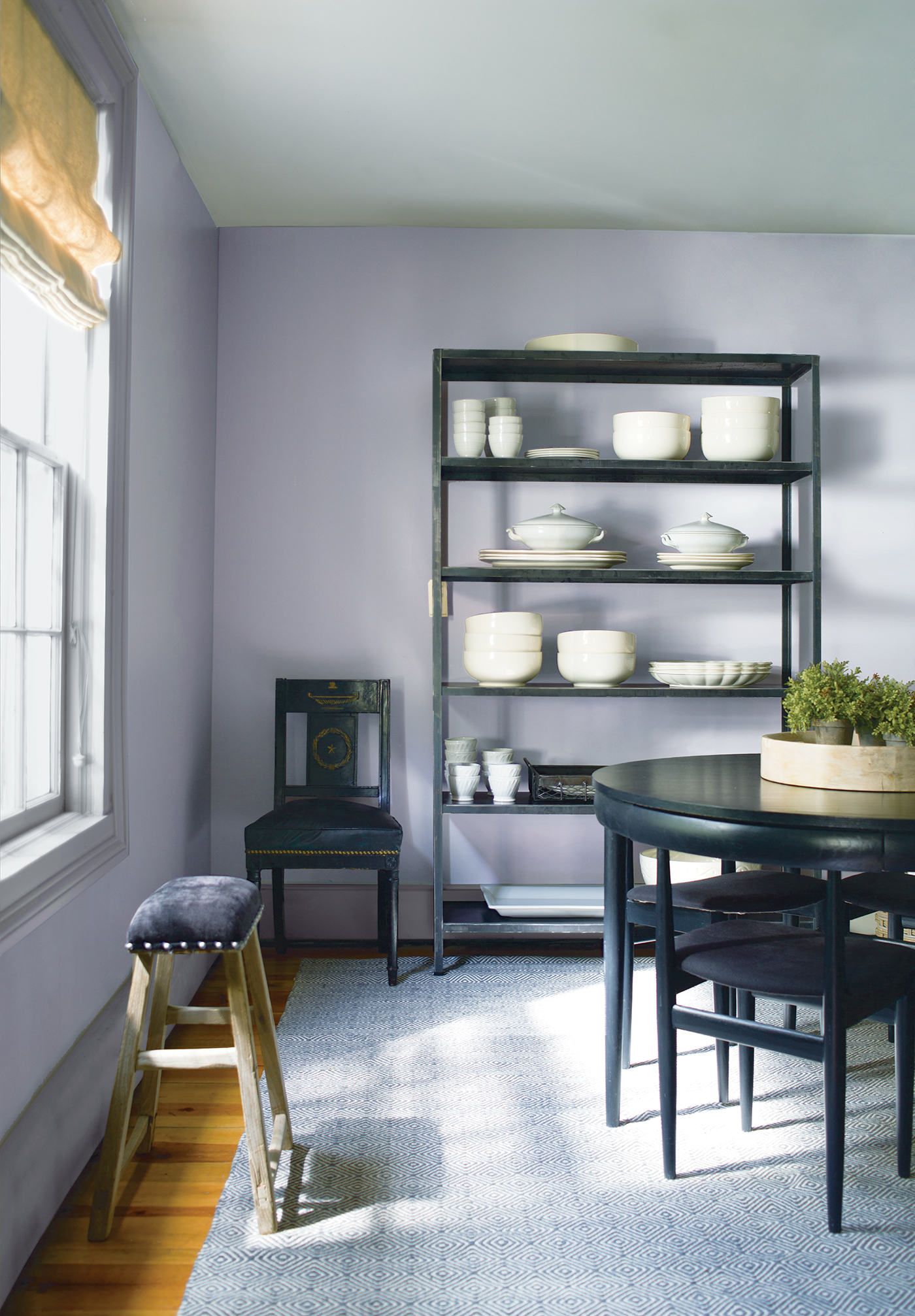 Light Purple Dining Room with Black Shelves