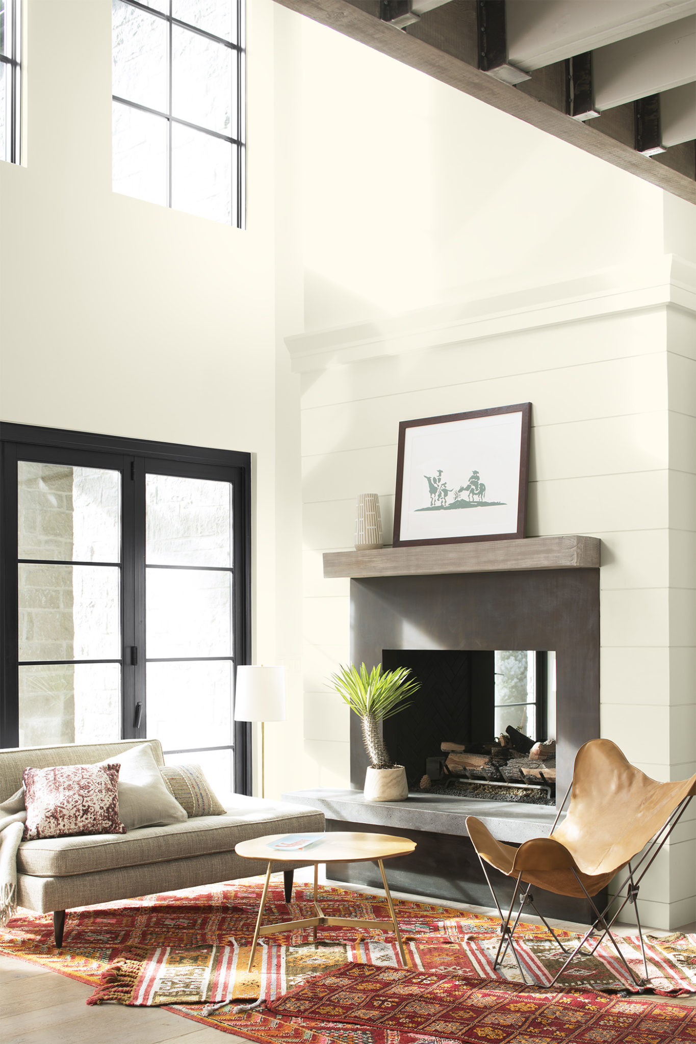 Regional Photography, Rocky Mountains, double sidded fireplace, persian area rug, vaulted ceiling, cactus, folding chair, french doors, mantel featuring (WALLS): Cloud White OC-130, Aura Matte, (Fireplace): Cloud White OC-130, Advance Satin, (Door): Black Satin 2131-10, Aura Grand Entrance, Satin