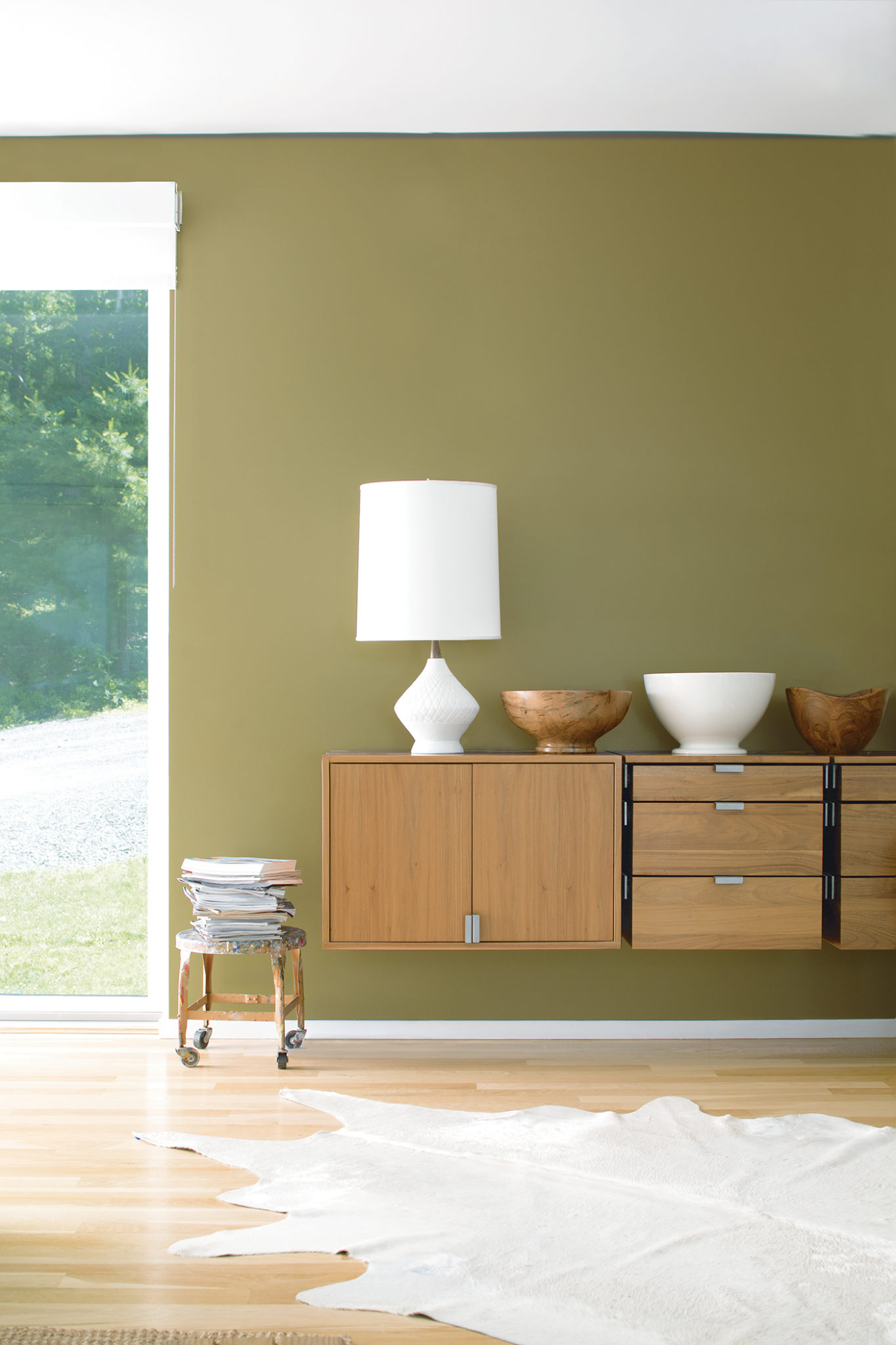 Modern Credenza Woodstock TanHC-20Interior vignette featuring modern wood credenza and window. Color A (Wall): Woodstock Tan HC-20.