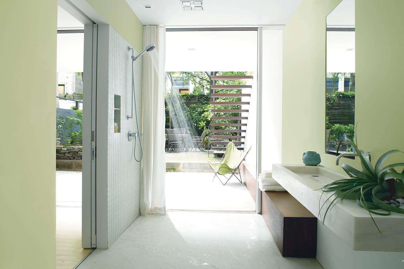 Pale Green Walls with Modern Shower Guilford GreenHC-116Image of Bathroom, featuring Guilford Green HC-116 (Aura Bath & Spa, Matte) on the Walls