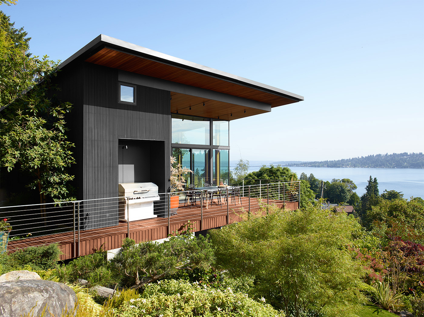 Regional Photography Pacific Northwest, Exterior, view, deck, grill, trees, water, wood, table, chairs, lake featuring (SIDING):Black 2132-10 ARBORCOAT® Exterior Stain, Semi Solid (DECK & CEILING): Leather Saddle Brown, ARBORCOAT® Exterior Stain, Semi ansparent