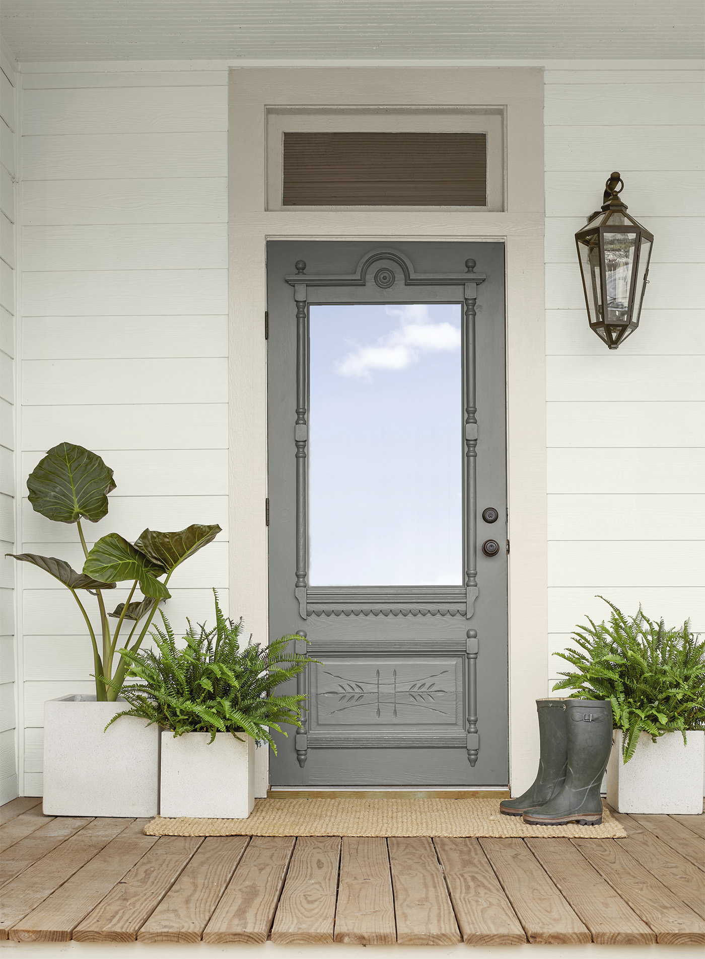 Seasonal Spring/Summer 2019 Photography. Front porch with grey door and planters. (SIDING): Seapearl OC-19, Regal Select Exterior MoorGard, Low Lustre (DOOR TRIM): Natural Cream OC-14, Regal Select Exterior MoorGlo, Soft Gloss (DOOR): Kendall Charcoal HC-166, Aura Grand Entrance, High Gloss (DECK): Natural, ARBORCOAT Exterior Stain, Translucent