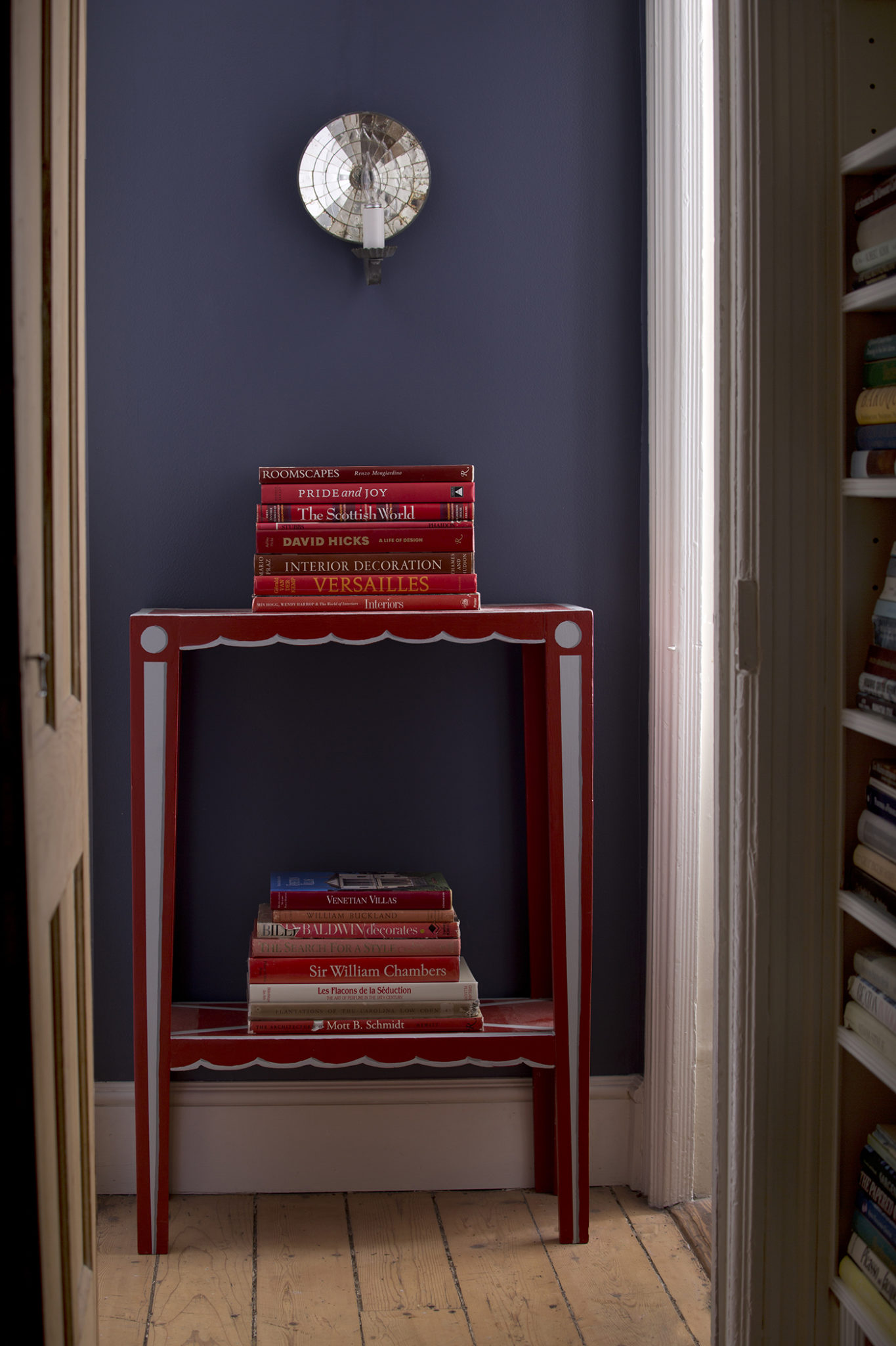 Wooden table set within a hallway with a stack of books atop it.