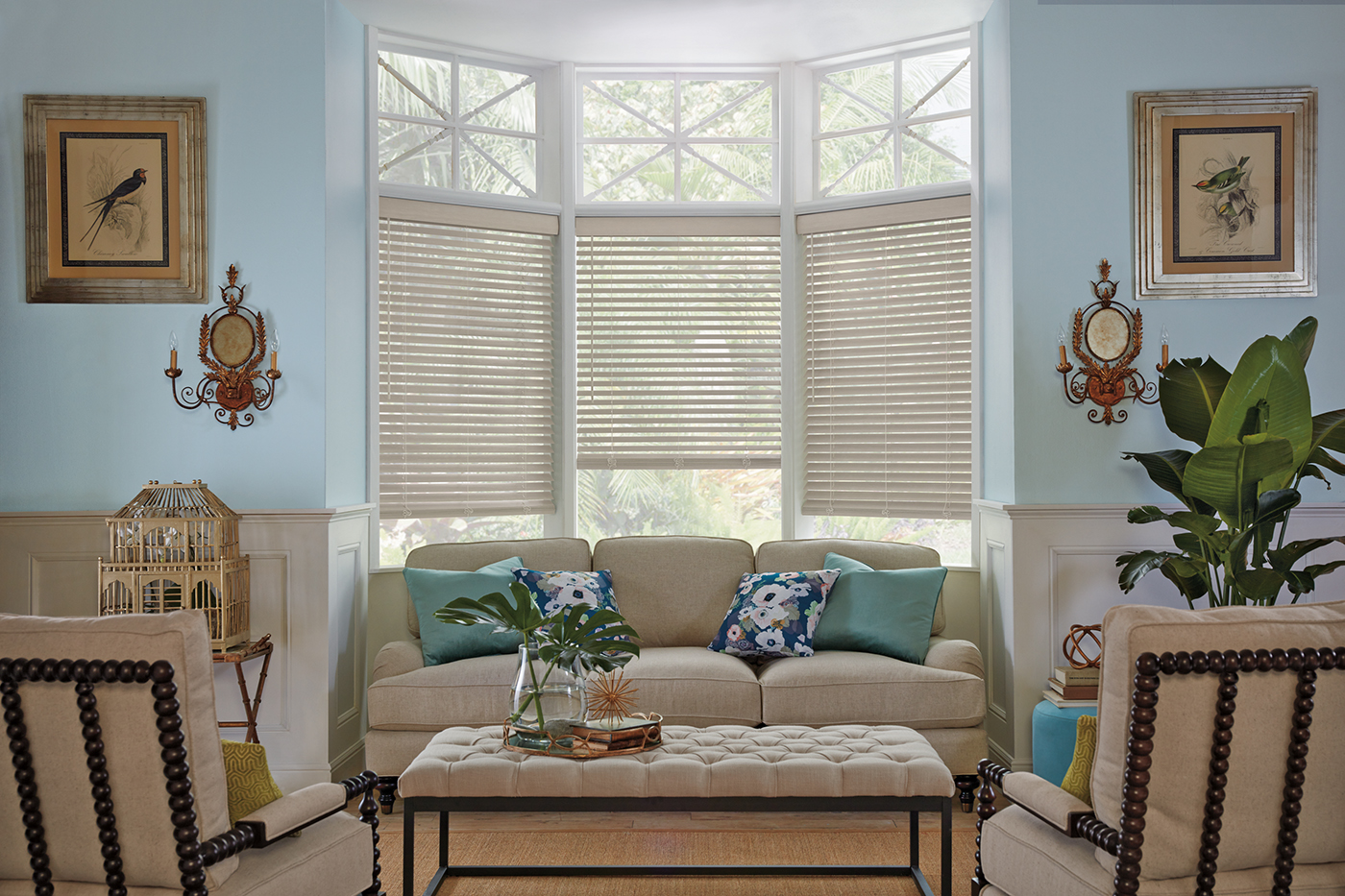 Standard Cordlock Coastal Living Room with Parkland Wood Blinds and Cornices
