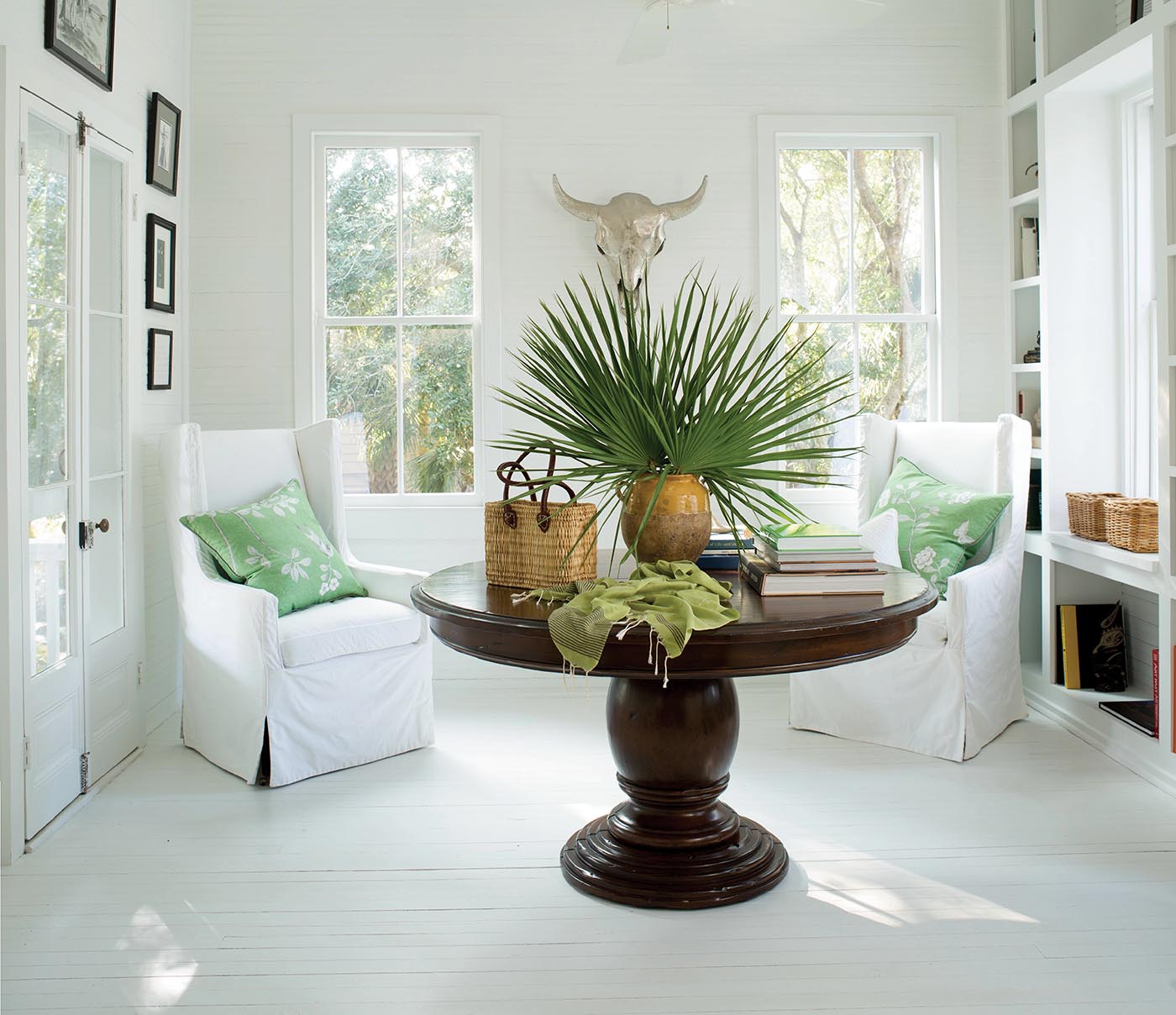 Residential interior featuring entry door, upholstered chair, built-in bookcase and central library table.