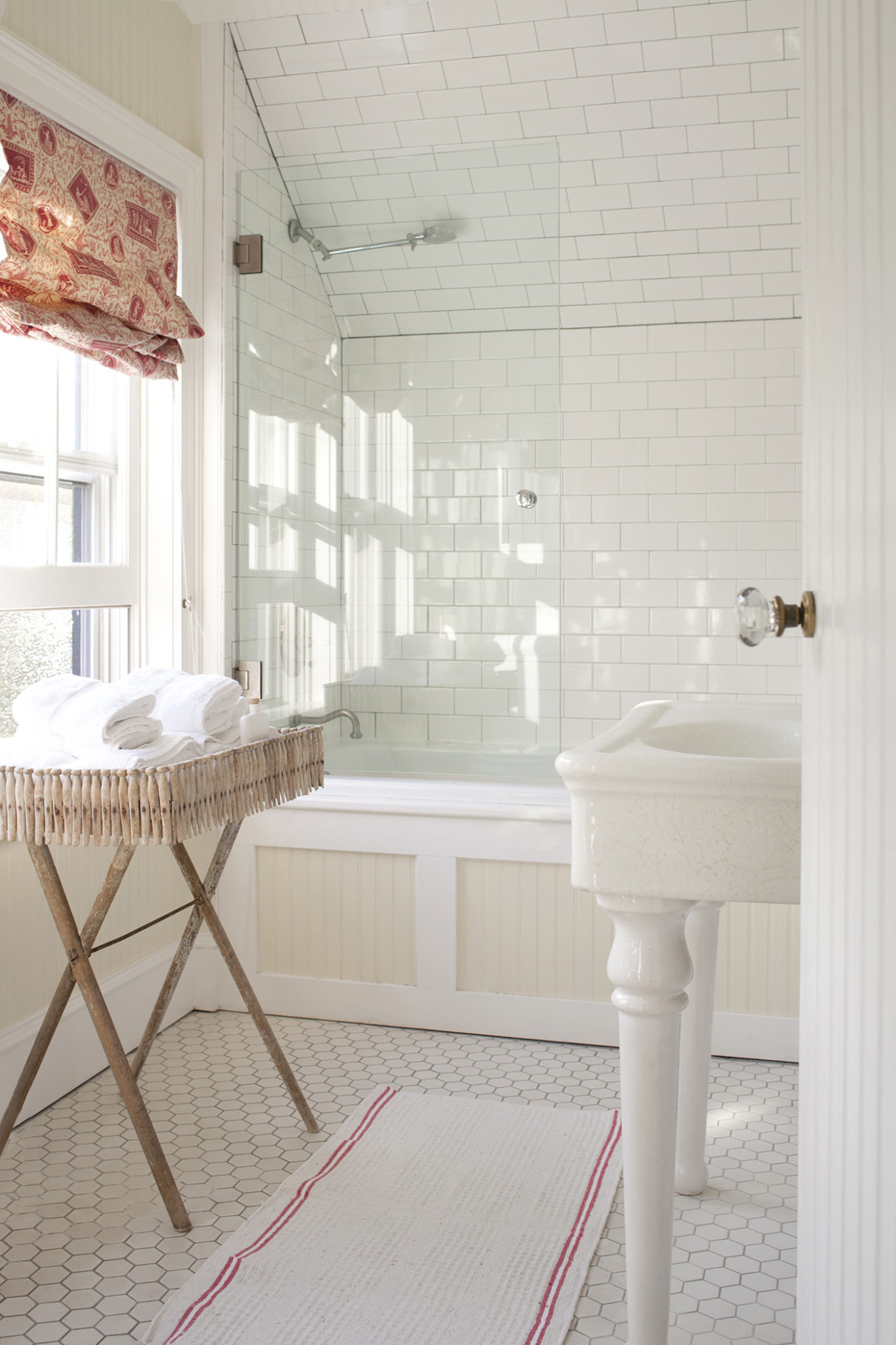 This image shows a white bathroom, with an orange window covering.