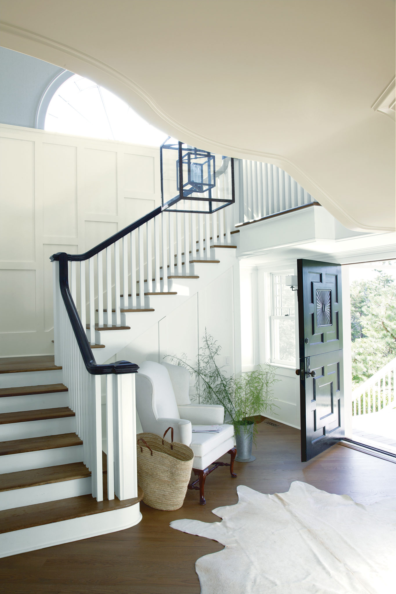 Residential interior featuring entry door, stairway, lantern pendant light, armchair and hide throw rug.