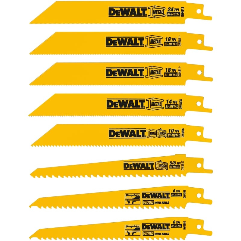 Be ready for a variety of wood and metal-cutting applications with the Dewalt. Each kit contains a selection of blades for common application all of them featuring reinforced teeth to withstand nails and other foreign objects and a 6-degree angle for fast