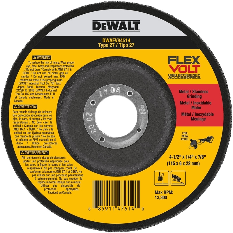 Be the first to review “DeWalt FlexVolt 4-1/2 in. D X 1/4 in. thick T X 7/8 in. S Metal Grinding Wheel 1 pc” Cancel reply