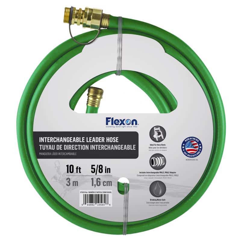 Fitting Coupling Material: Brass *Medium-Duty *Hot Water Use: No *Kink Resistant: Yes *Length: 10 *Material: Rubber *Product Type: Leader Hose *Reel Included: No *Safe for Drinking Water: Yes *Sub Brand: *Brand Name: Flexon *UV Resistant: No *Burst Pressure: 400 *Yes *Diameter: 5/8 *Color: *Expandable: No *Duty Rating: Medium Duty *Hose Length Range: <25 ft. *Grade: *Crush Resistant Couplings: Yes *Nozzle Included: