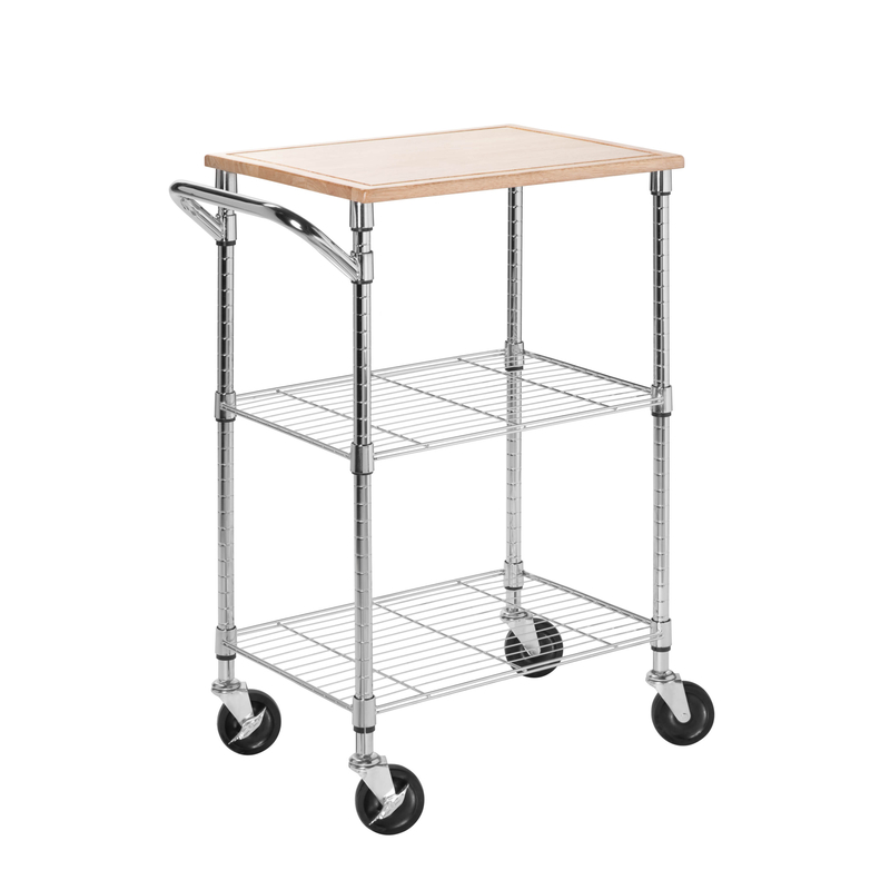 - Features a hardwood cutting surface, two adjustable shelves and lockable wheels