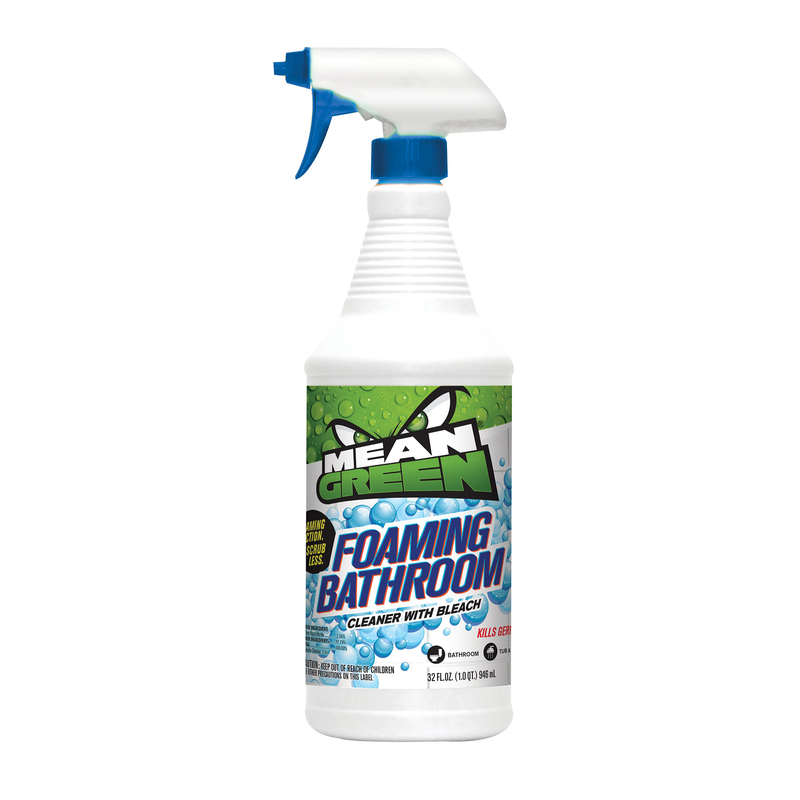 Mean Green Foaming Bathroom Cleaner with Bleach safely and effectively cleans bathroom surfaces you and your family contact every day. It quickly removes soap scum, hard water and tough calcium and lime stains so you can scrub less while still killing 99.9% of germs.