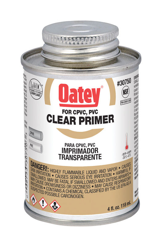 Oatey Clear Primer is an NSF-listed, aggressive primer for use on all schedules and classes of PVC and CPVC pipe and fittings. It removes contaminants such as surface dirt, grease and grime as well as softens the pipe surface to allow for a fast, secure solvent weld.