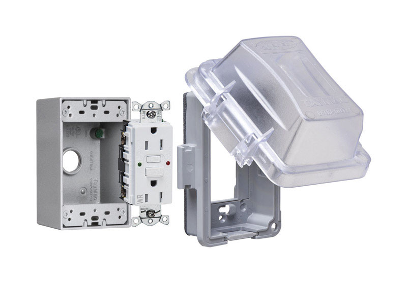- Kit includes extra duty clear plastic WP cover, metal WP box, attached gasket and weather tamper resistant 15-amp self-test white GFCI receptacle